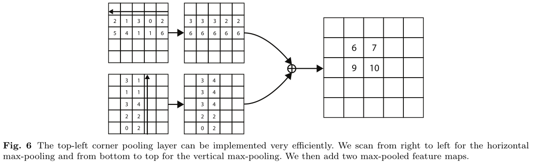 Figure6也是针对左上角点做corner pooling的示意图,是Figure3的具体数值计算例子,该图一共计算了4个点的corner pooling结果。