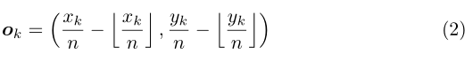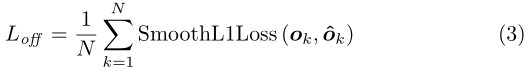 CornerNet的第三个输出是offset,这个值和目标检测算法中预测的offset类似却完全不一样,说类似是因为都是偏置信息,说不一样是因为在目标检测算法中预测的offset是表示预测框和anchor之间的偏置,而这里的offset是表示在取整计算时丢失的精度信息,如上式(2),其中(xk,yk)表示第k个角点的原图坐标值,n代表下采样因子,ok表示特征图缩放回原图后与原gt框的精度损失。然后通过公式(3)的smooth L1损失函数监督学习该参数,和常见的目标检测算法中的回归支路类似。