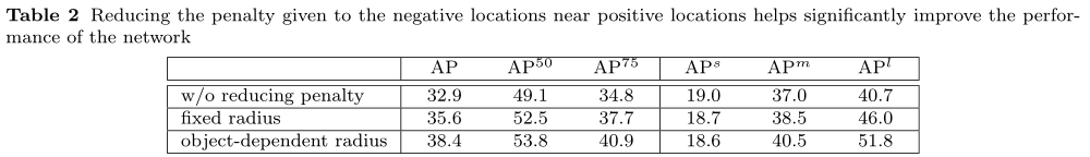 上表Table2是关于不同位置负样本采取不同权重的损失函数的效果,第一行为无惩罚减少机制,第二行为固定半径,第三行为采用目标计算得到的半径值,效果提升明显,尤其是在中、大目标上。