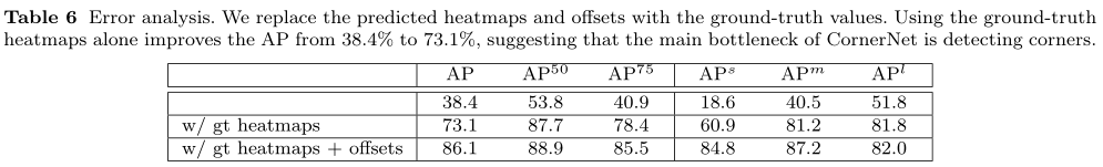 上表Table6错误分析。第一行是这篇文章的算法结果;第二行是将角点预测结果用ground truth代替,可以看到提升非常大;第三行是进一步将偏置用ground truth代替,相比之下提升会小很多。这说明目前该算法的瓶颈主要在于角点预测。