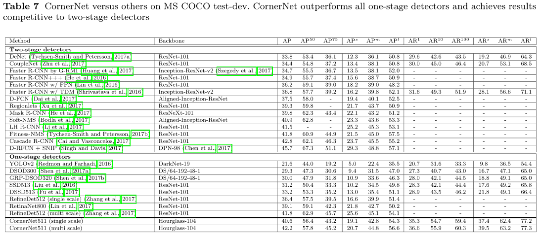 上表Table7是connerNet和其他优秀目标检测算法的效果对比。