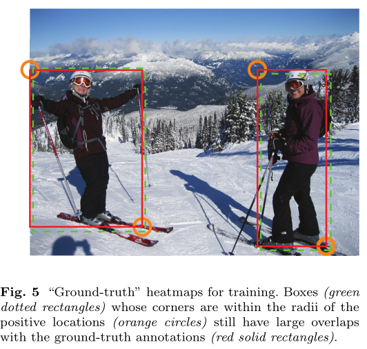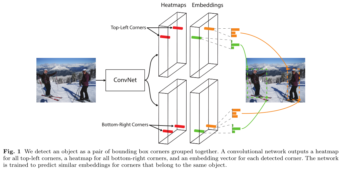 CornerNet的第二个输出是embeddings,对应文章中group corner的内容。前面介绍了关于角点的检测,在那部分中对角点的预测都是独立的,不涉及一个目标的一对角点的概念,因此如何找到一个目标的两个角点就是第三个输出embedding做的工作。这部分是受associative embedding那篇文章的启发,简而言之就是基于不同角点的embedding vector之间的距离找到每个目标的一对角点,如果一个左上角角点和一个右下角角点属于同一个目标,那么二者的embedding vector之间的距离应该很小。