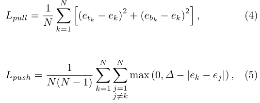 embedding这部分的训练是通过两个损失函数实现的,etk表示属于k类目标的左上角角点的embedding vector,ebk表示属于k类目标的右下角角点的embedding vector,ek表示etk和ebk的均值。公式(4)用来缩小属于同一个目标(k类目标)的两个角点的embedding vector(etk和ebk)距离。公式(5)用来扩大不属于同一个目标的两个角点的embedding vector距离。