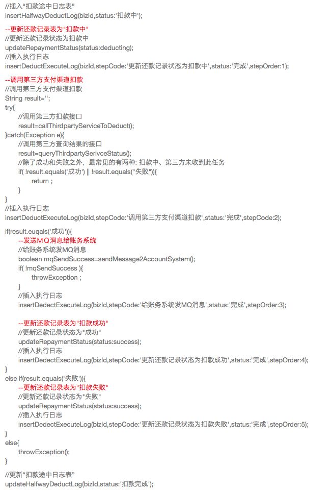 为了便于读者理解,这里以伪代码的形式把整个扣款过程写出来,且分几个迭代版本不断增强。