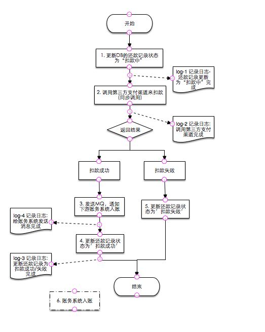 为了避免对业务流程造成干扰,上图中把同样处于主执行路径上的、起着日志记录作用的"log-x"这些步骤,在各自所处的位置以虚线表示,记得它们是主流程的一部分。这些“log-x”步骤在实现上,是建立一张日志表,以持久化、结构化的方式来记录,并不是 logback 之类的文件日志,因为这些日志在异常时的恢复,起着重要作用。