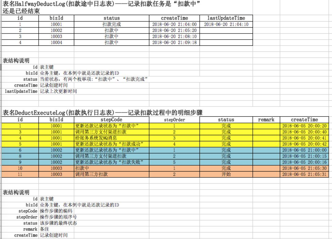 其二,“扣款执行日志表”是用于记录扣款任务的执行过程。该表的记录不更新,只插入。如果某个扣款任务需要恢复补偿,则从该表中找到上次执行的“断点”,继续向后执行。上图中举了 3 组数据作为例子:黄色背景是一笔完成的、扣款成功的日志;浅绿色背景是一笔完成的、扣款失败的日志;浅橙色背景是一笔进行中(正在执行调用第三方扣款)的日志。