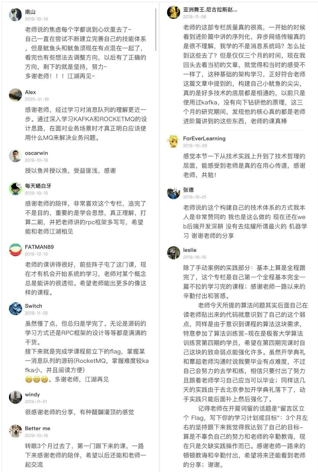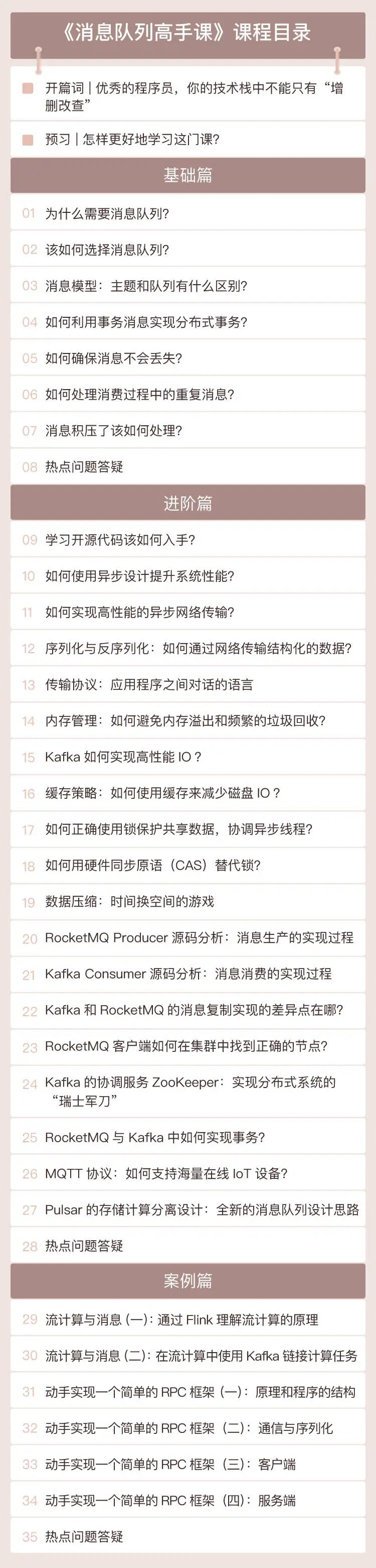 这个专栏总共 41 讲,李玥拿着“显微镜”带你分析开源消息队列的源码,让你具备从源码角度分析和解决实际业务问题的能力,并且借由消息队列的底层技术,带你了解其优秀的设计思想,理解各种“轮子”的实现原理,从而真正提升编程能力。
