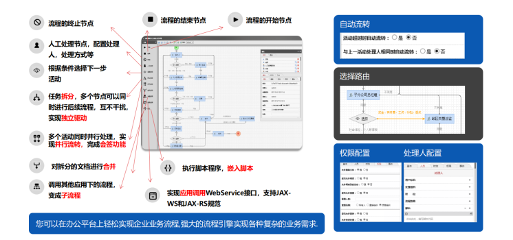 全功能流程引擎。基于任务驱动,开放式服务驱动,高灵活性、扩展性,事件定义丰富。包含人工、自动、拆分、合并、并行、定时、服务调用、子流程等功能。应用场景丰富,可轻松实现公文、合同、项目管理等复杂工作流应用。