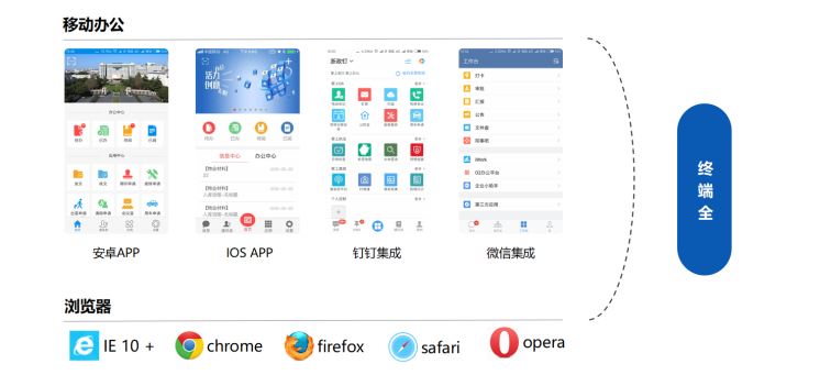 终端全:O2OA覆盖了几乎全部终端。您可以使用IE10+、Chrome、Firefox、Safari、Opera等主流浏览器(包括使用相同内核的其他浏览器如:360浏览器、百度浏览器、猎豹浏览器等等)。除此之外,您还可以使用安卓、IOS移动APP进行流程处理等办公,也可以将O2OA与企业钉钉、微信集成,实现真正的随时随地办公。