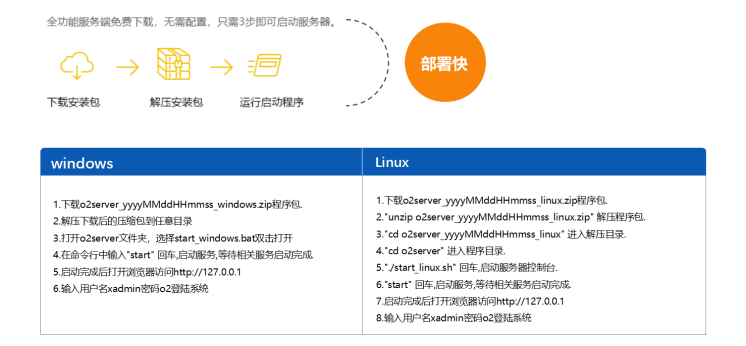 O2OA部署非常简单,只需要下载 -> 解压 -> 运行三步即可完成服务器部署