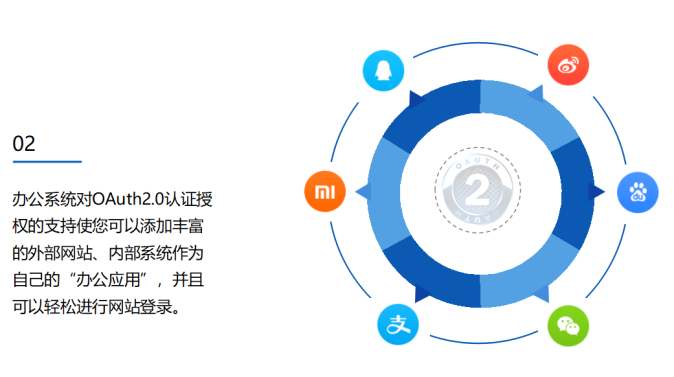 O2OA办公系统对OAuth2.0认证授权的支持使您可以添加丰富的外部网站、内部系统作为自己的“办公应用”,并且可以轻松进行网站登录。