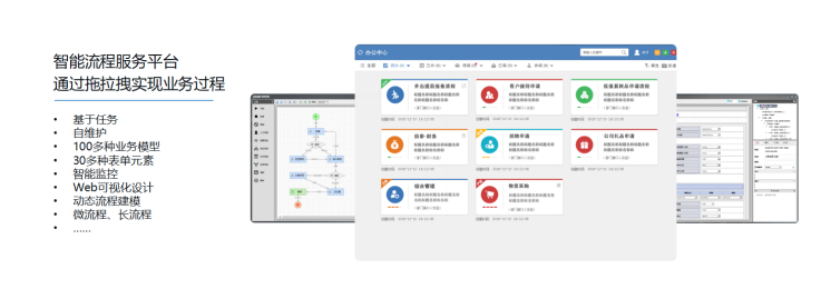 流程服务平台拥有基于任务、自维护、动态流程建模,您可以使用100多种业务模型,30多种表单元素在Web可视化设计界面轻松实现微流程、长流程。除此之外,流程平台智能监控也可以让您时刻了解平台的健康状况和业务运行情况。