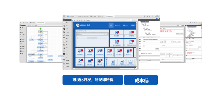 在O2OA,流程,表单,门户等开发均采用所见即所得的可视化开发模式,开发方便,成本更低。让您可以更快速地响应业务需求变更。