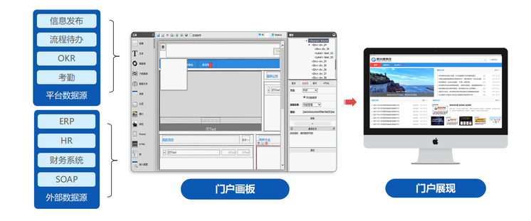 具体可视化表单编辑的,支持HTML直接导入的,支持各类数据源,外部应用集成能力的,所见即所得的门户管理平台。适用于实现企业信息化门户系统,可以轻松结合O2OA提供的认证设置与其他系统进行单点认证集成。