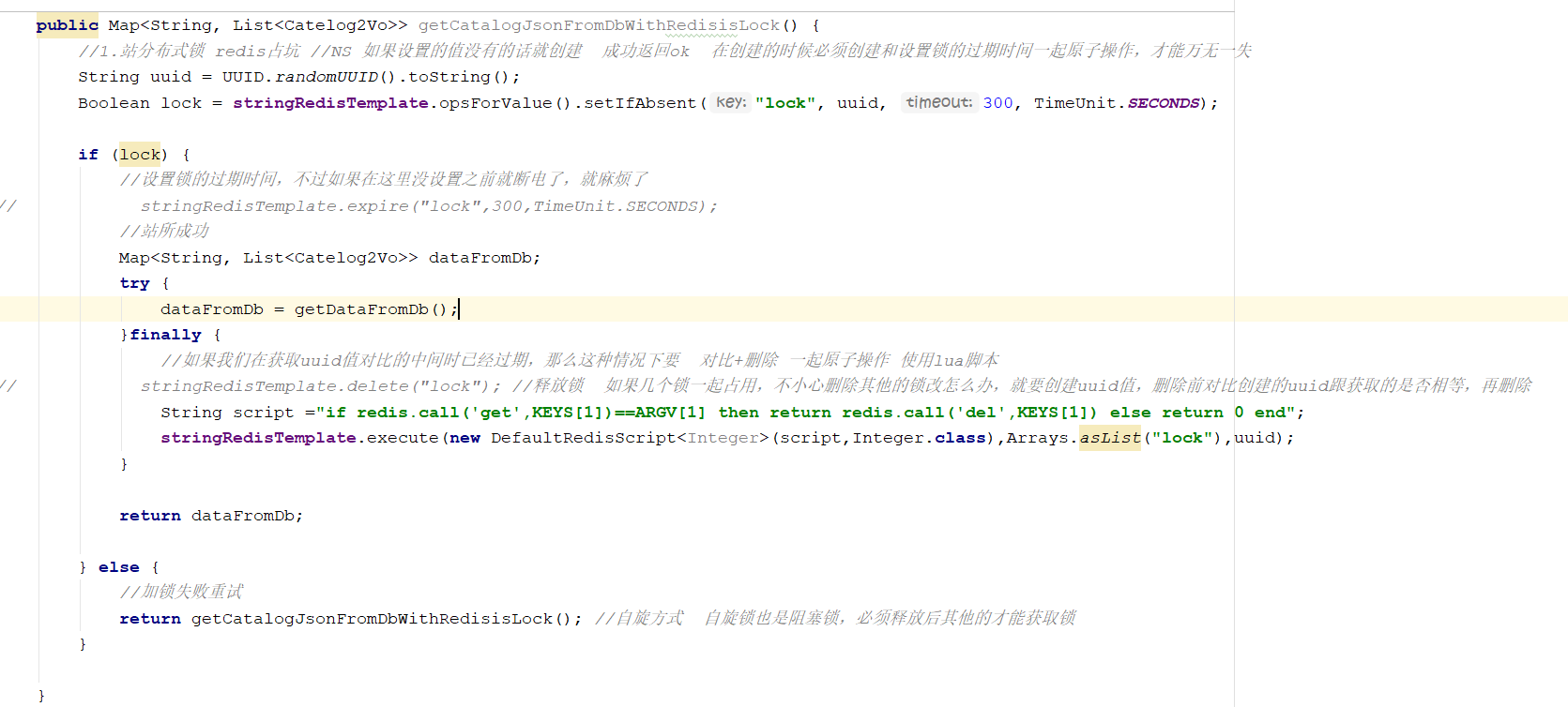 return getCatalogJsonFromDbWithRedisisLock(); //自旋方式 自旋锁也是阻塞锁,必须释放后其他的才能获取锁