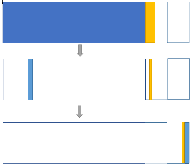 我绘制了一幅图来表明这个过程。其中色块代表对象,白色框分别代表Eden区(大)和Survivor区(小)。Eden区理所当然大一些,否则新建对象很快就导致Eden区满,进而触发Minor GC,有悖于初衷。