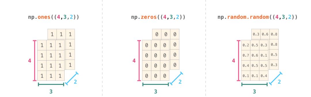 我们也可以使用上面提到的方法(ones()、zeros() 和 random.random()),只要写入一个描述我们创建的矩阵维数的元组即可: