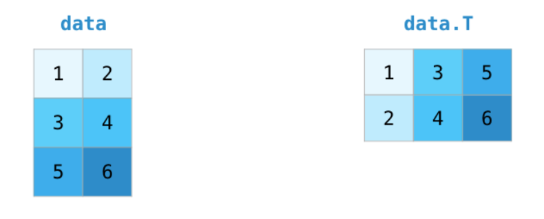 处理矩阵时的一个常见需求是旋转矩阵。当需要对两个矩阵执行点乘运算并对齐它们共享的维度时,通常需要进行转置。NumPy 数组有一个方便的方法 T 来求得矩阵转置: