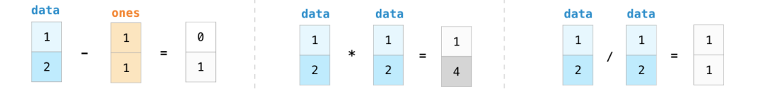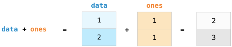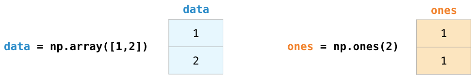 让我们创建两个 NumPy 数组来展示数组运算功能。我们将下图两个数组称为 data 和 ones: