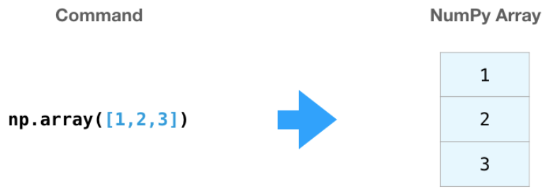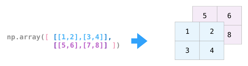 我们可以通过传递一个 python 列表并使用 np.array()来创建 NumPy 数组(极大可能是多维数组)。在本例中,python 创建的数组如下图右所示: