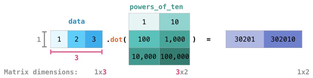 我在上图的右下角添加了矩阵维数,来强调这两个矩阵的临近边必须有相同的维数。你可以把上述运算视为: