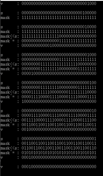 unsigned long s = 8 * sizeof(v); // bit size; must be power of 2, 此处为32