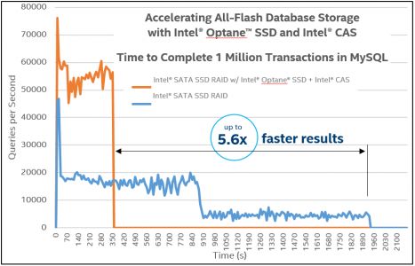 英特尔用Sysbench做了一组对比试验,搭配有Optane的一组测试数据比纯SATA组的数据完成1百万事务处理的速度快了5.6倍。有了傲腾之后的数据库查询速度明显提升。图中的蓝色曲线有几次大的变化主要是因为Sysbench改变了不同的测试复杂,比如开始是单行操作,连续多行操作,不连续多行操作等,即使是在不同负载下,有傲腾和CAS的一组测试数据也表现的非常稳定。
