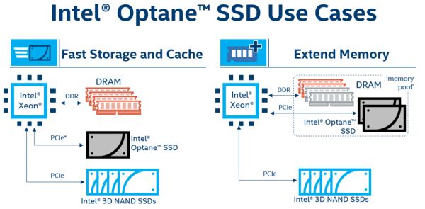 Optane的应用定位比较特殊:既能跟普通的3D NAND站在一个队伍,组成快存储和Cache方案。也能跟DRAM站在一块组成内存池,作为扩展内存。如下图所示: