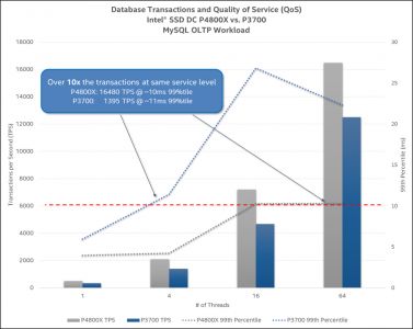 当用作快存储的时候,简单说就是加速。作为数据库,对性能最直接的要求就是TPM更高,多用户多线程下的高TPM是数据库的最基础的要求。英特尔用DC P3700和DC P4800X做了一个对比实验(除了硬盘以外,别的全一样),用Sysbench给出OLTP压力,做出的测试结果如下图。