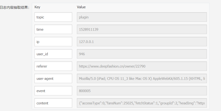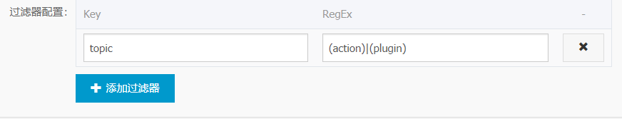 如上图所示,分别对url字段和status字段设置了两个过滤器。指定字段Key存在且Value符合正则表达式的日志会被保留。