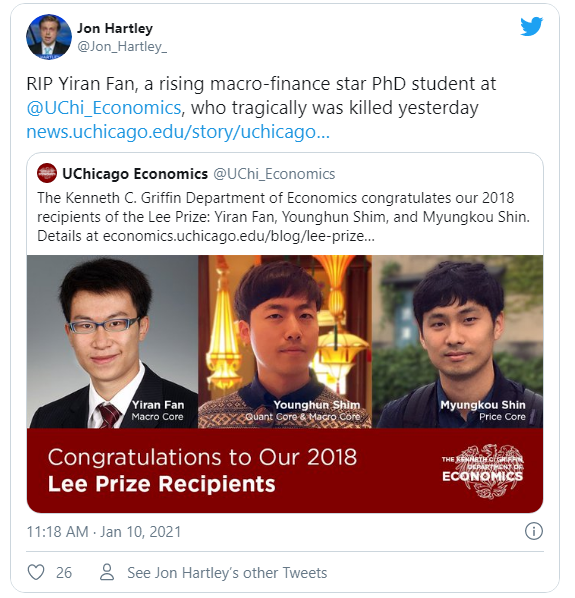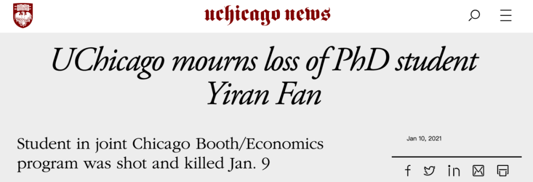 事件发生后,芝加哥大学进行了确认,证实这名芝加哥大学的学生名叫Yiran Fan,是该校商学院和经济系联合项目的博士四年级生。