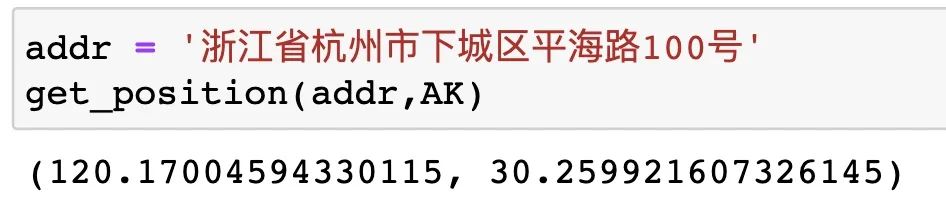 之后启动Jupyter Notebook,只要不到十行代码就能将地址转成经纬度,直接看代码,没有什么特别需要解释的,利用地址和AK构造查询URL,之后使用requests请求并取出经纬度,代码拿走就能用👇