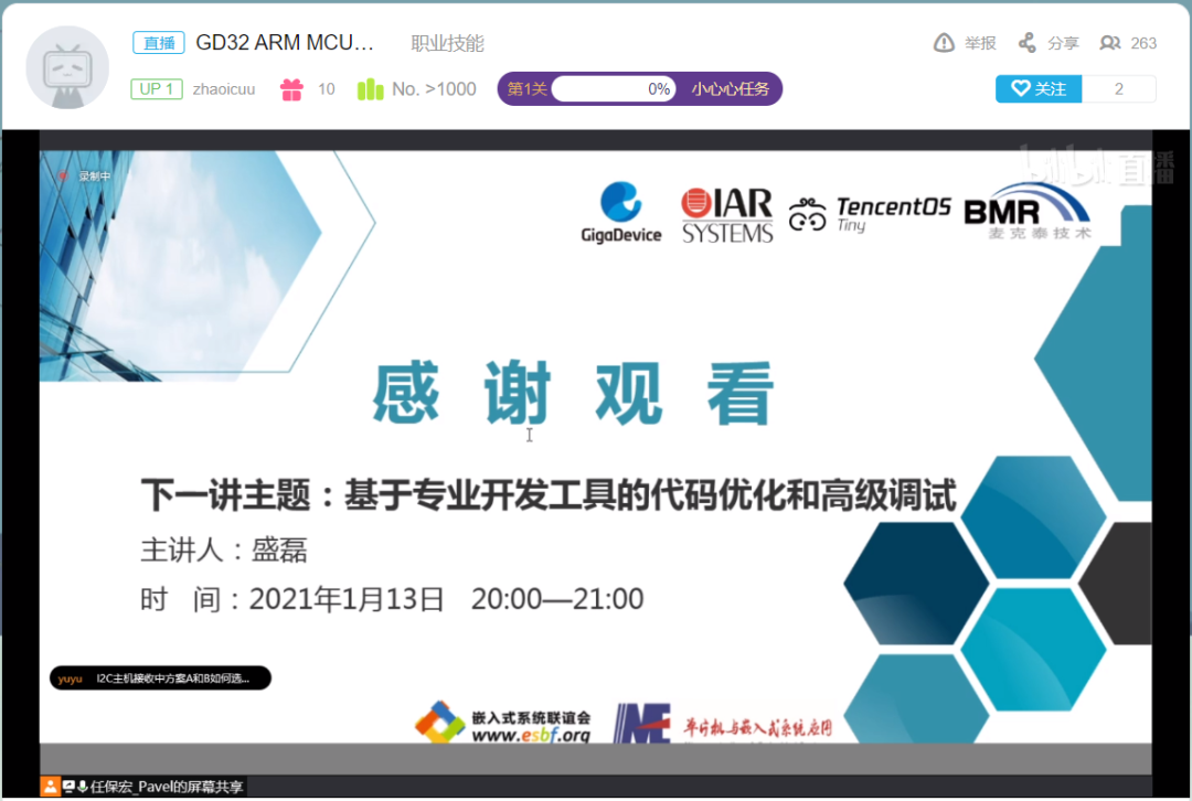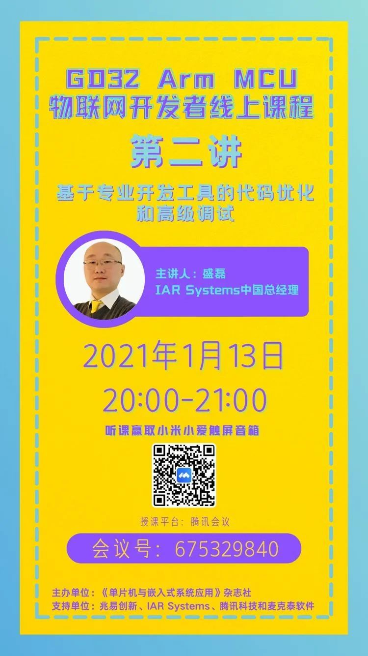 由《单片机与嵌入式系统应用》杂志社主办,兆易创新、IAR Systems、腾讯科技和麦克泰软件支持,嵌入式系统联谊会指导的“GD32 Arm MCU物联网开发者线上课程”第一次课程昨天晚上完美开讲!好多嵌友早早就在直播室等待,你们的支持,就是我们不断前进的动力。