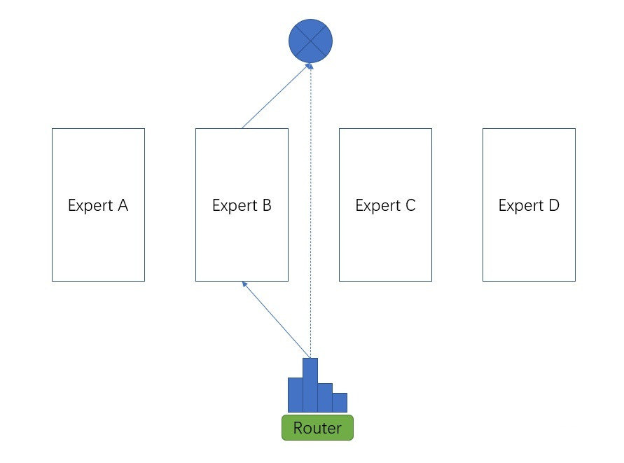 在一般情况下,基于MoE,一个样例进来,会被好几个子网络(expert)处理,这几个子网络的处理结果可以加权求和,每个子网络的权重是通过一个叫router的模块计算出来的(如下图所示)。MoE可以理解成一种模型的集成 (ensemble),根据top k 激活一部分子网络。按照我们对模型集成的经验,一般来说,集成的结果应该要比每一个子网络单独的效果好 (这一点很重要,后文还会提到)。当然,这也让MoE的不足之处展现出来,每个子网络都需要进行计算,总计算量是所有子网络计算量之和。不过,MoE 使用所有子网络不一定就比只使用一个网络好,sparsity 可以让每个子网络更“聚焦”,分工更明确,带来的优势还需进一步观察。