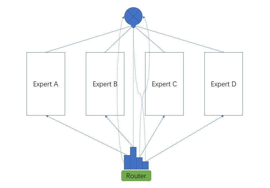 如果上面的A, B, C, D 子网络是被分配到不同的设备上去运行的,那么在子网络参数规模相同的情况下,MoE 计算速度和Switch Transformer 可以保持一致,MoE 四个设备同时都用满了,但Switch Transformer 里一个样例只激活一个设备,设备总体利用率可能不高。但MoE的效果应该比Switch Transformer好,因为每个样例都激活了所有的专家网络,一般情况下,集成的效果会更好(但稀疏化后也可能更好,因为每个专家会更加聚焦和专注)。当然,一个批次里包含很多样例,在Switch Transformer里,平均来说每个设备都会有活干,Switch Transformer仍会有速度优势。