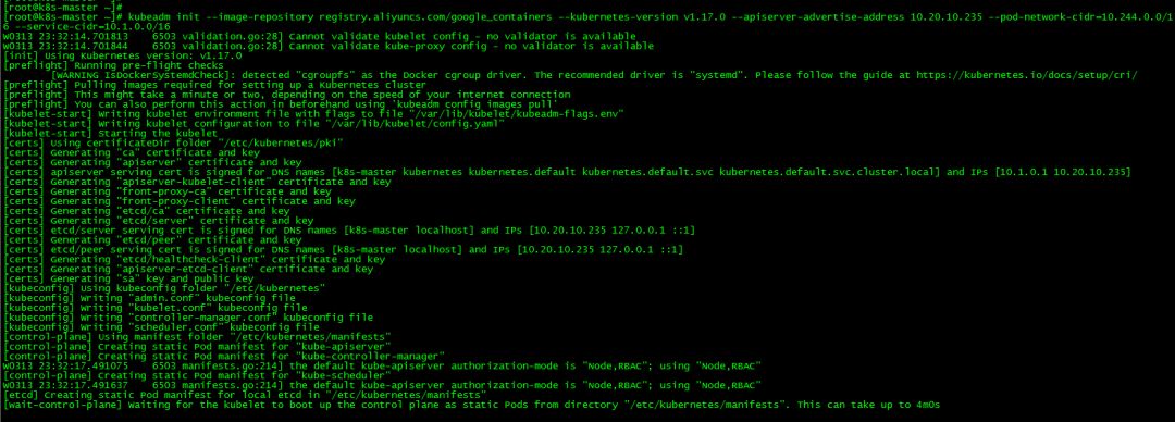 kubeadm init --image-repository registry.aliyuncs.com/google_containers --kubernetes-version v1.17.0 --apiserver-advertise-address 10.20.10.235 --pod-network-cidr=10.244.0.0/16 --service-cidr=10.1.0.0/16