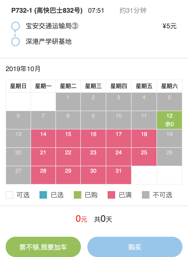 这个就是订票页面,显示当前月的车票情况,根据图示,红色为已满,绿色为已购,灰色为不可选