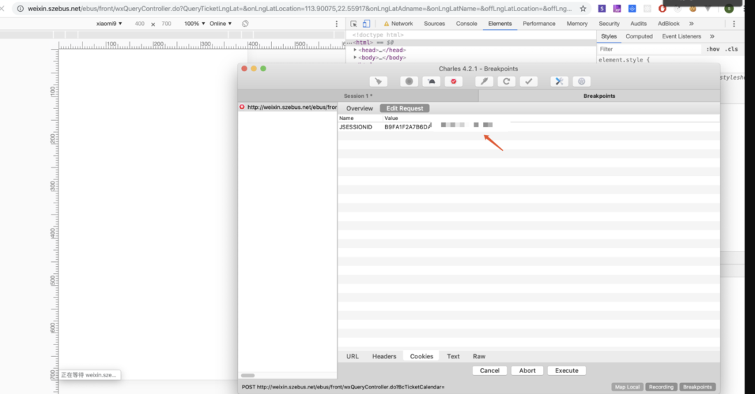 然后再次访问,这时候断点就生效了,弹出一个tab名为break points,可以看到之所以我们还是不能访问到目标网址,是因为sessionId不对,所以我们把抓取到的cookie在填入到里面,点击execute