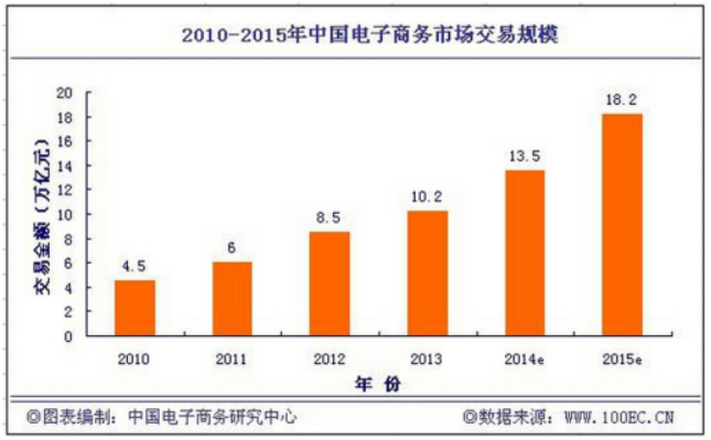 中国电子商务研究中心数据显示,截止到2012年底,中国电子商务市场交易规模达7.85万亿人民币,同比增长30.83%。其中,B2B电子商务交易额 达6.25万亿,同比增长27%。而2011年全年,中国电子商务市场交易额达6万亿人民币,同比增长33%,占GDP比重上升到13%;2012年,电 子商务占GDP的比重已经高达15%。预计2013年我国电子商务规模将突破十万亿大关。