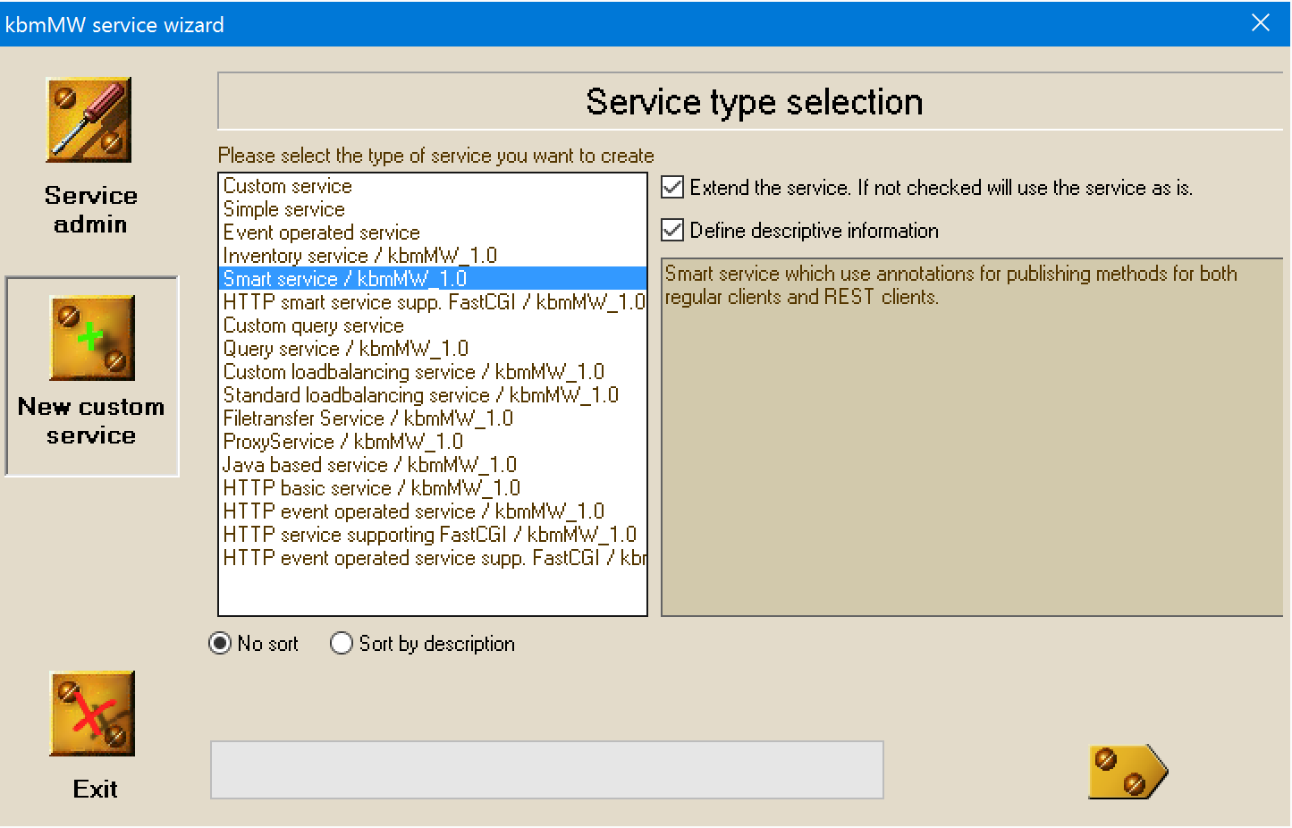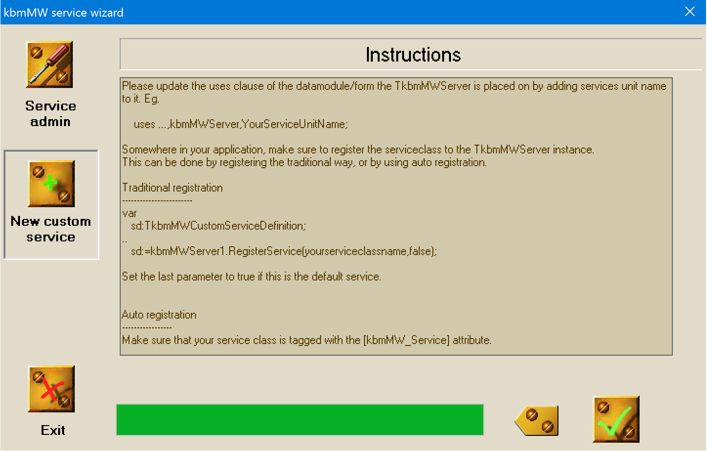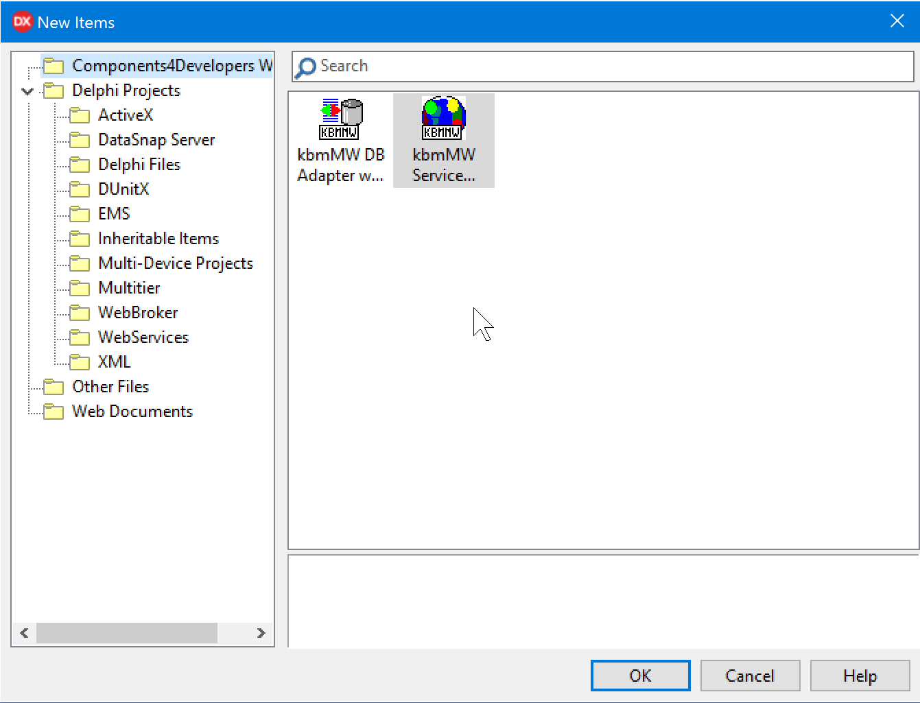 在Delphi中,单击文件 - 新建 - 其他 - Components4Developers向导,然后选择kbmMW服务向导。单击确定。