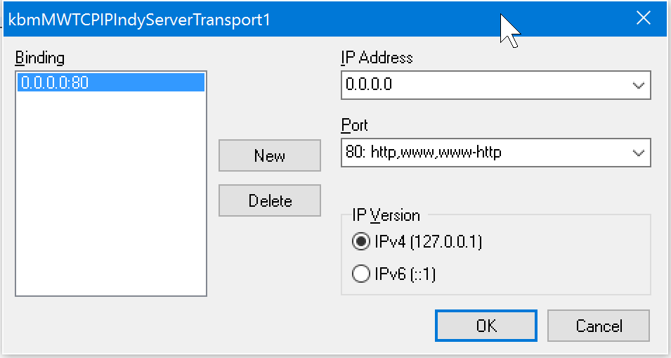 双击kbmMWTCPIPIndyServerTransport1的Bindings属性以打开其编辑器。为0.0.0.0端口80添加绑定,这是默认的HTTP服务器端口。您可以选择所需的任何端口其他绑定,但让要REST用户知道。