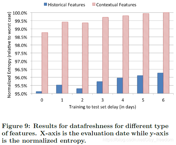 可以发现随着天数的增加,data freshness 也变得越来越差,模型的性能也越来越差。所以,针对每天的偏差进行重新训练就非常有必要。