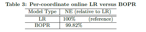 考虑在LR中,每个稀疏要素值只有一个权重, 而不是一个平均值和方差,LR model size只有BOPR的一半。
