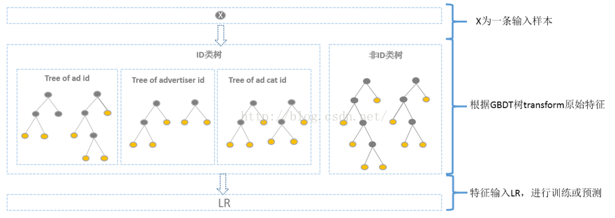 按照Facebook、Kaggle竞赛的思路,不加入广告侧的Ad ID特征?但是现CTR预估中,Ad ID类特征是很重要的特征,故建树时需要考虑Ad ID。直接将Ad ID加入到建树的feature中?但是Ad ID过多,直接将Ad ID作为feature进行建树不可行。下面将介绍针对现有CTR预估场景GBDT+LR的融合方案。