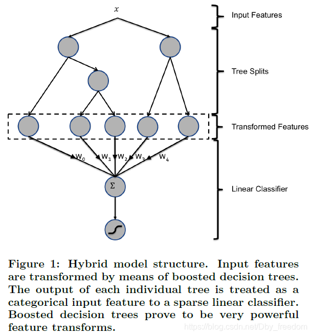 如何根据GBDT建的两类树,对原始特征进行映射?以如下图3为例,当一条样本x进来之后,遍历两类树到叶子节点,得到的特征作为LR的输入。当AD曝光不充分不足以训练树时,其它树恰好作为补充。