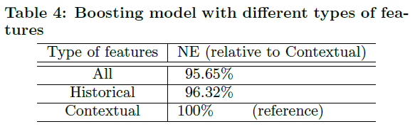 针对两大类特征:历史信息特征(用户+广告)、上下文特征。论文还研究了这两类特征对模型性能的贡献程度。先给出结论:历史信息特征占主导地位。