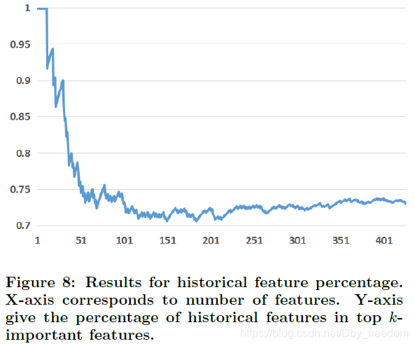 同样,先把特征按照重要程度排序,再画图。横轴是特征数量,纵轴是 historical 特征在 top k 个重要特征中所占的百分比。可以看到前10个特征中,全是历史信息特征;前20个特征中,只有2个上下文特征。所以:历史信息特征比上下文特征重要太多了。