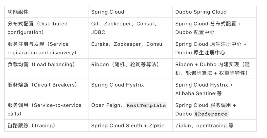 通过以下表格,简要地对比 Spring Cloud 与 Dubbo Spring Cloud 的功能特性: