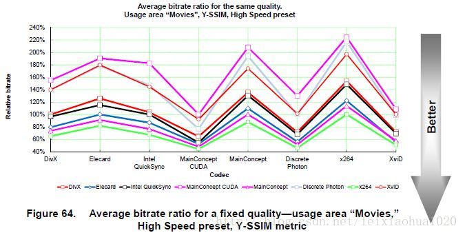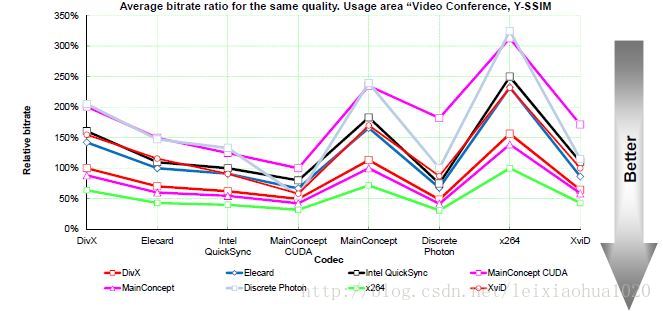 下列这张表列出了在相同的视频质量的前提下,不同的编码器需要使用的码率。可以看出,X264确实是最强悍的。