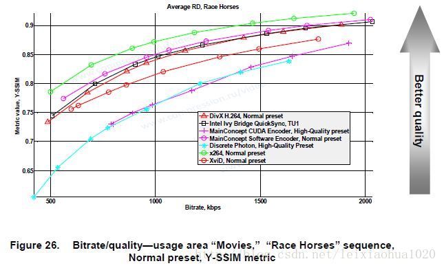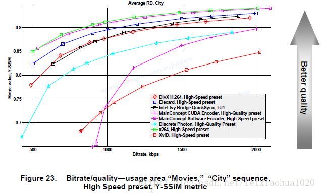 这张图的视频分辨率是QCIF(176×144)。曲线横坐标是视频的码率,纵坐标是计算出来的SSIM。SSIM取值0-1之间,值越大,代表视频质量越好。从曲线中可以看出,在码率相同的情况下,x264编码的视频质量要高于其他编码器(绿色的线)。第二名是MainConcept。